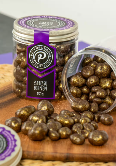 Pentru toţi cei care iubesc cafeaua: Boabele noastre de espresso îmbină aroma intensă a unor boabe espresso nobile cu fineţea amară a unei ciocolate negre de calitate superioară. Finalizate cu o uşoară strălucire aurie, ele nu doar că emană eleganţă, dar oferă şi un moment de răsfăţ de neegalat.